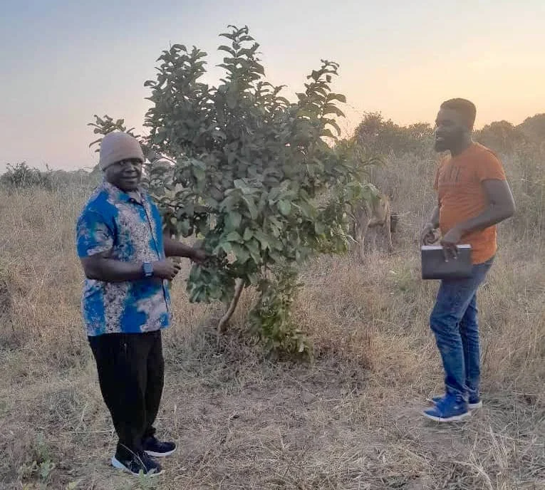 Rabson Kambwali, our in-country facilitator and Dallas Lwiindi, a local agroecology expert, inspect trees that were donated by Malambo Grassroots.